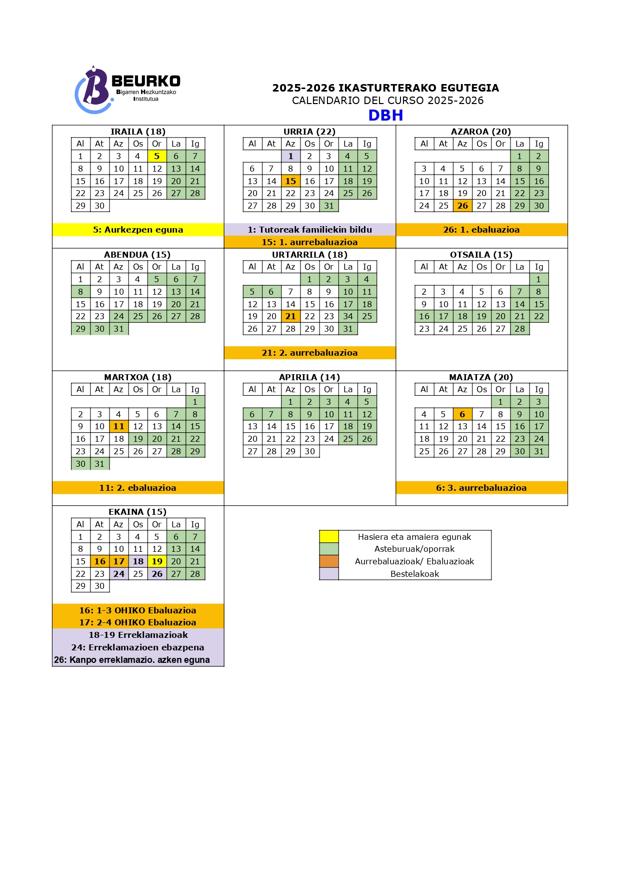 Ebaluazio saioen egutegiak